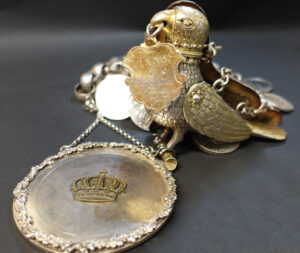 Ein wert­vol­les und schö­nes Stück altost­frie­si­scher Sil­ber­ar­beit stellt der an der Königs­ket­te des ASV befind­li­che Sil­benıo­gel dar. Kopf, Flü­gel, Hals­band und Schwanz­fe­dern sind ver­gol­det. Der Vogel trägt eine Pla­ket­te im Schna­bel, die auf der einen Sei­te das Auricher Wap­pen, und auf der ande­ren Sei­te die Jah­res­zahl 1616 mit dem Zusatz: Reno­va­t­um d. 24.Januar 1825, C.B. Con­ring zeigt. C.B.Conring war von 1816 bis 1840 Bür­ger­meis­ter in Aurich. Er starb am 24. März 1844.